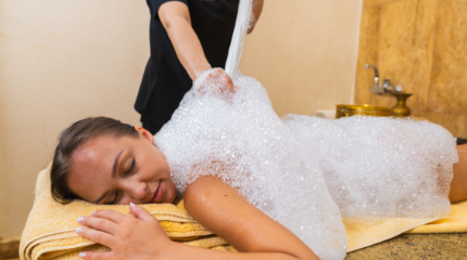 This traditional cleansing, purifying and nourishing ceremony has evolved over thousands of years. Whilst you're lying down on heated marble, the Therapist exfoliates your body with soap foam scrub called "Kese”. Duration: 50 min